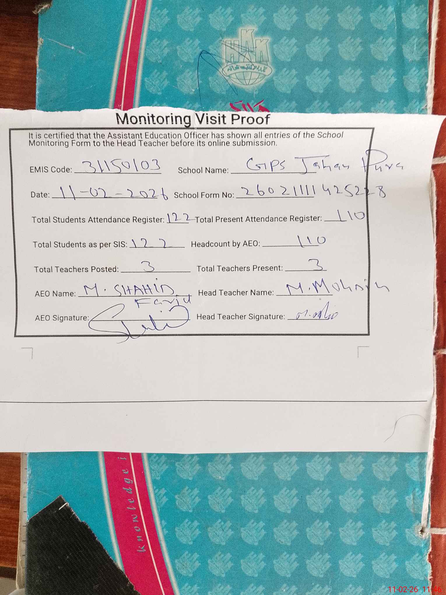 | Attendance Register | Head Teacher | MEA with School | Visit Proof |