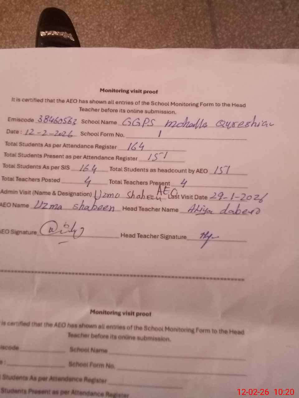 | Monitoring Date: 12-02-2026 | Start Time: 12-02-2026 09:59 AM | End Time: 12-02-2026 10:20 AM | Name of MEA: UZ**** SH**** | |