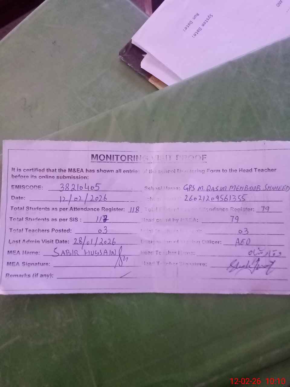 | Remarks (Use Separate Page if Required): no teacher absent total students on register 118 total students on SiS 117 last admin visit by AEO on 28 Jan 2026 | |||||