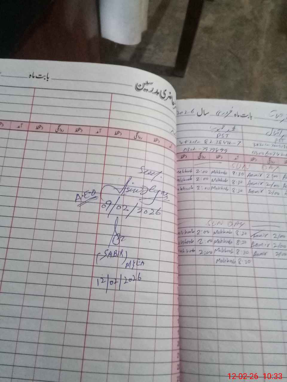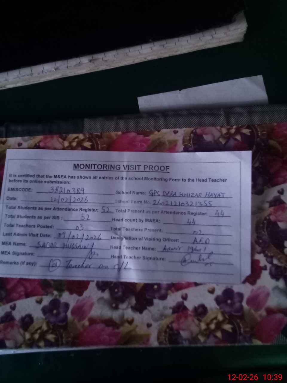 | Remarks (Use Separate Page if Required): no teacher absent total students on register 52 total students on SiS 52 last admin visit by AEO on 09 Feb 2026 | |||||