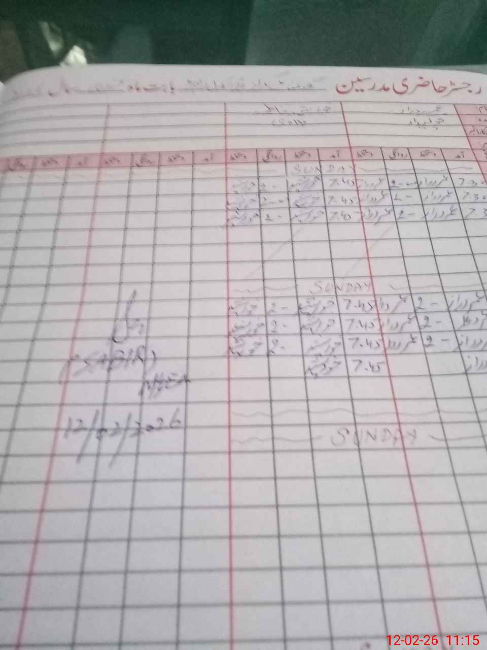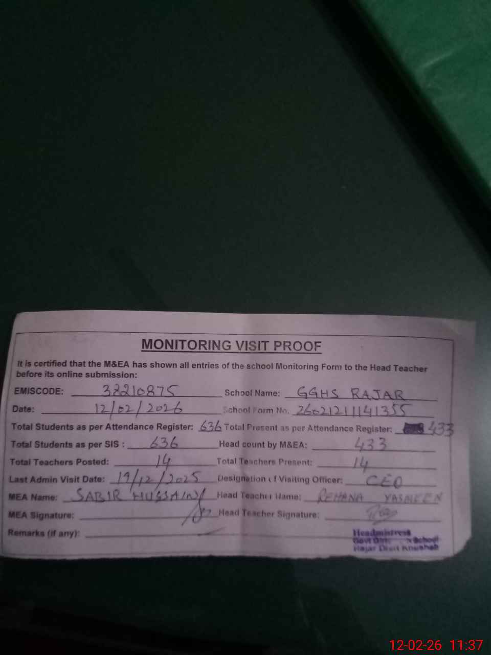 | Remarks (Use Separate Page if Required): no teacher absent total students on register 636 total students on SiS 636 last admin visit by CEO on 19 Dec 2025 | |||||