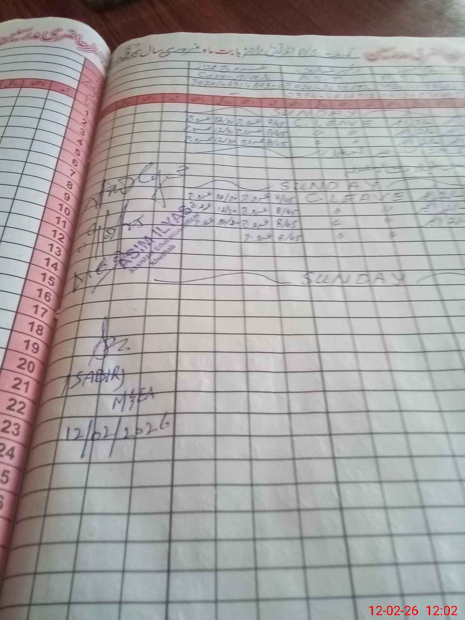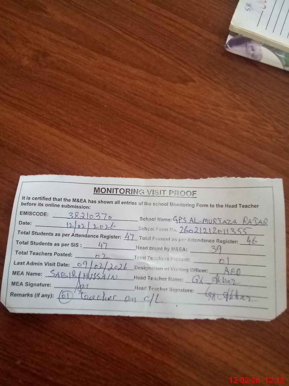 | Remarks (Use Separate Page if Required): no teacher absent total students on register 47 total students on SiS 47 last admin visit by AEO 09 Feb 2026 | |||||