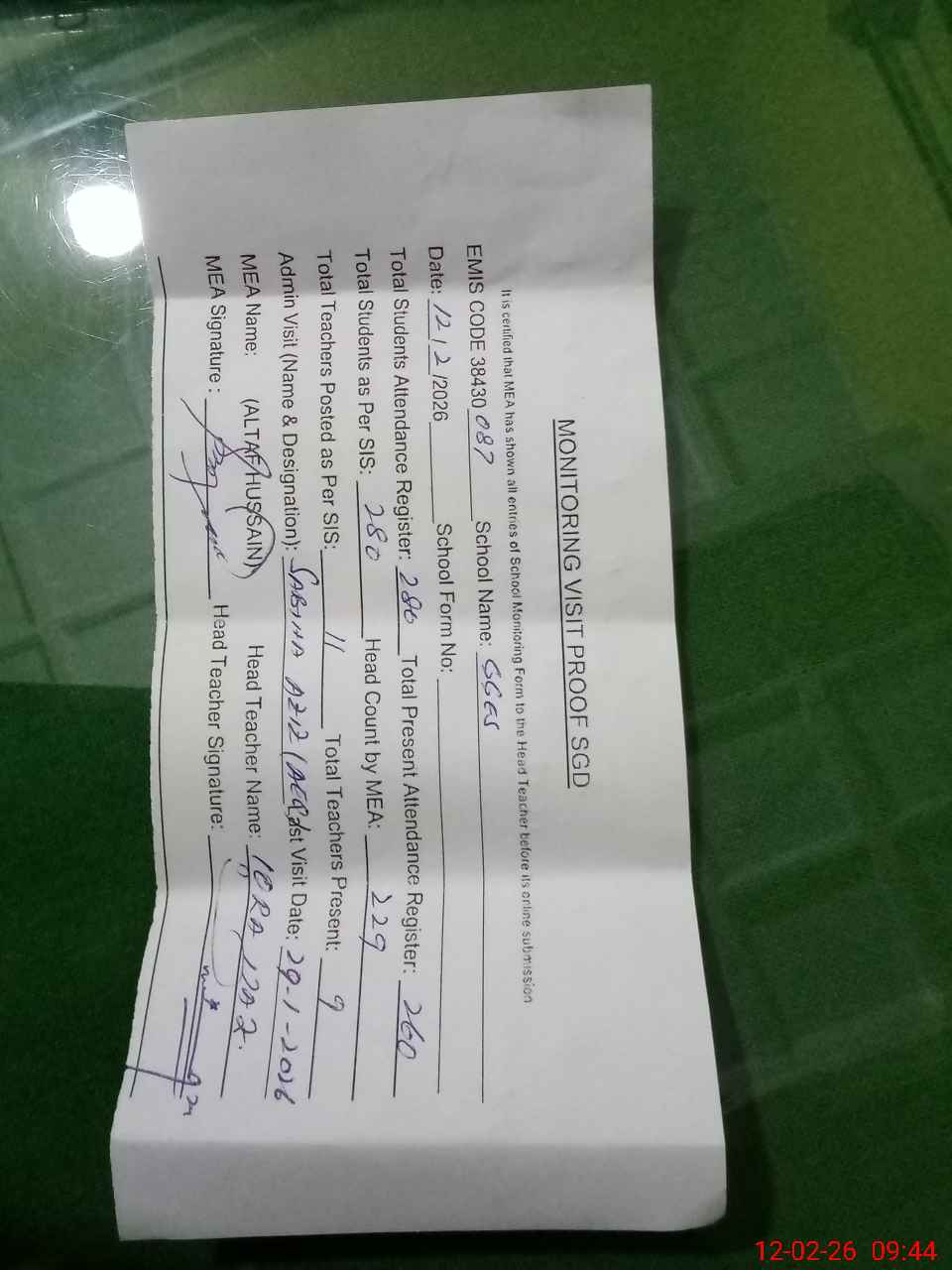 | Attendance Register | Head Teacher | MEA with School | Visit Proof |