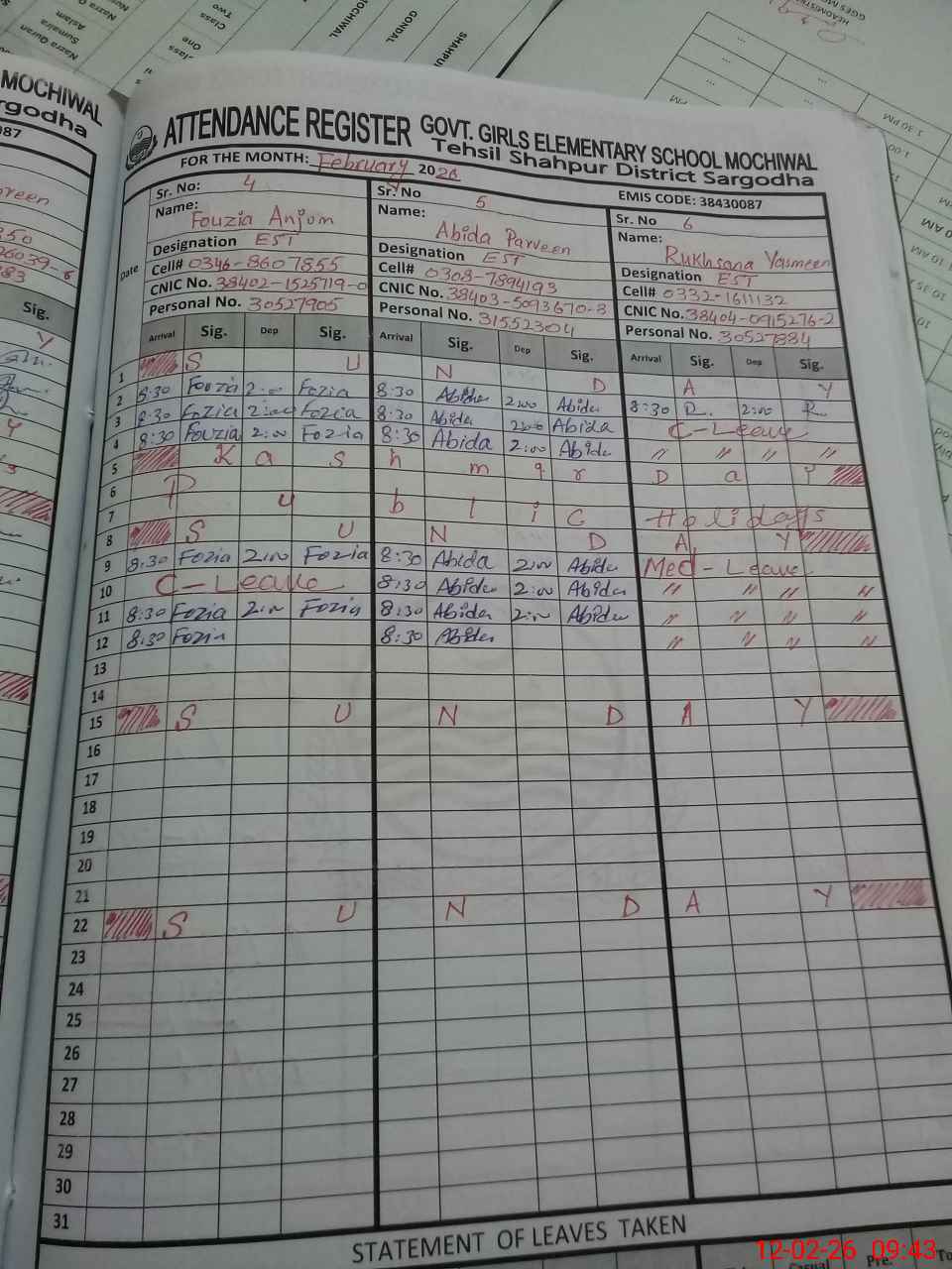 | CNIC | Full Name | Designation | R/C | Absence During Last Calender Month |