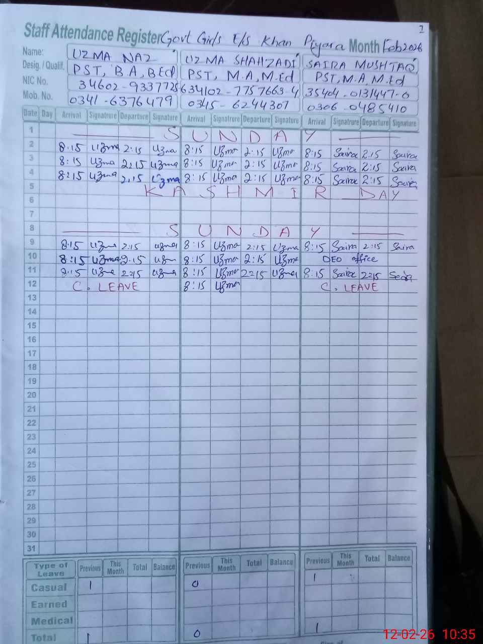 | CNIC | Full Name | Designation | R/C | Absence During Last Calender Month |