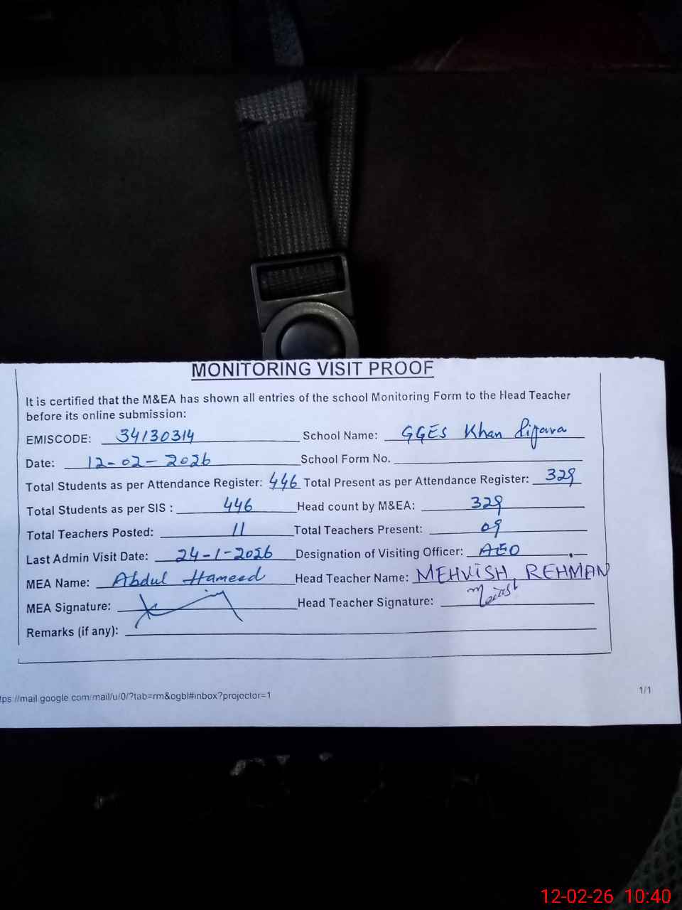 | Attendance Register | Head Teacher | MEA with School | Visit Proof |