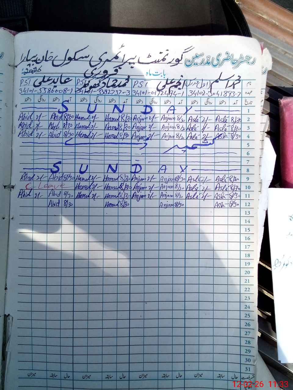 | CNIC | Full Name | Designation | R/C | Absence During Last Calender Month |