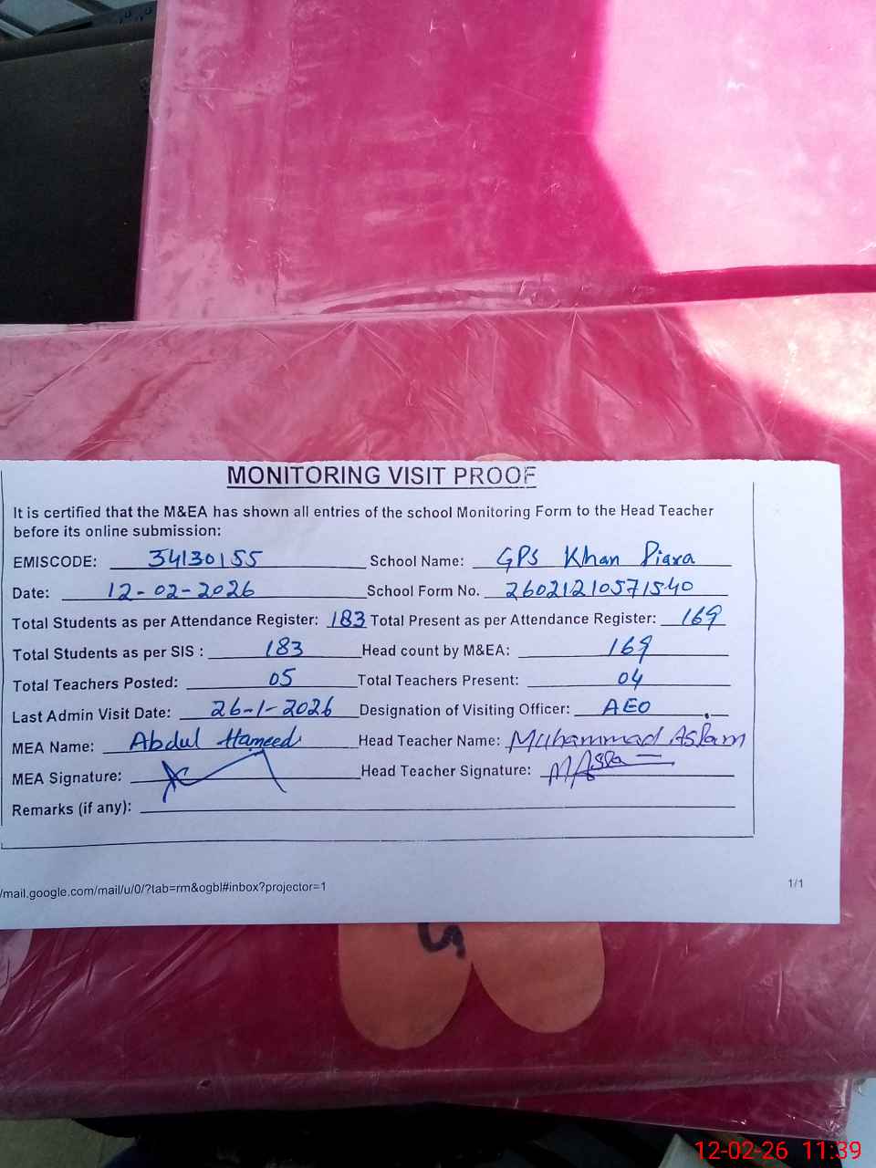 | Attendance Register | Head Teacher | MEA with School | Visit Proof |