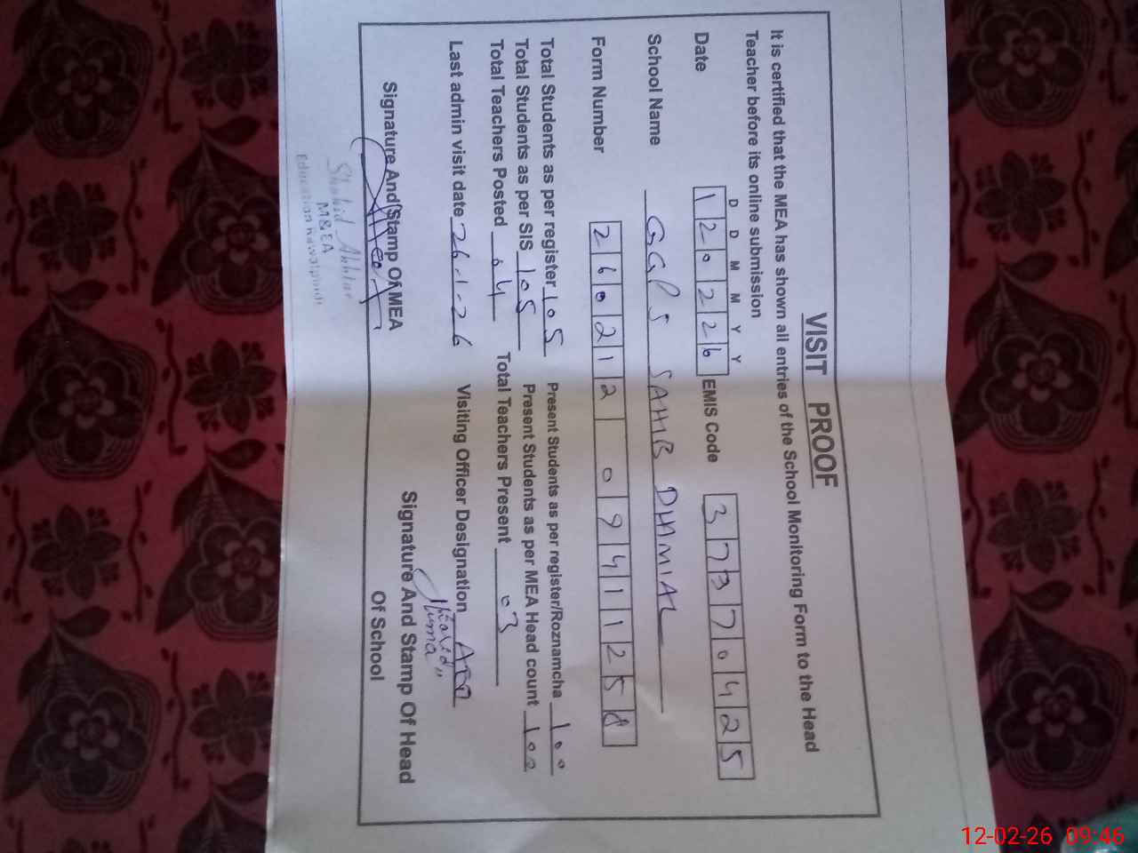 | Certified that this School was Inspected by the Undersigned MEA/DMO Today and the Information Stated Above is as Per Record. | |||||