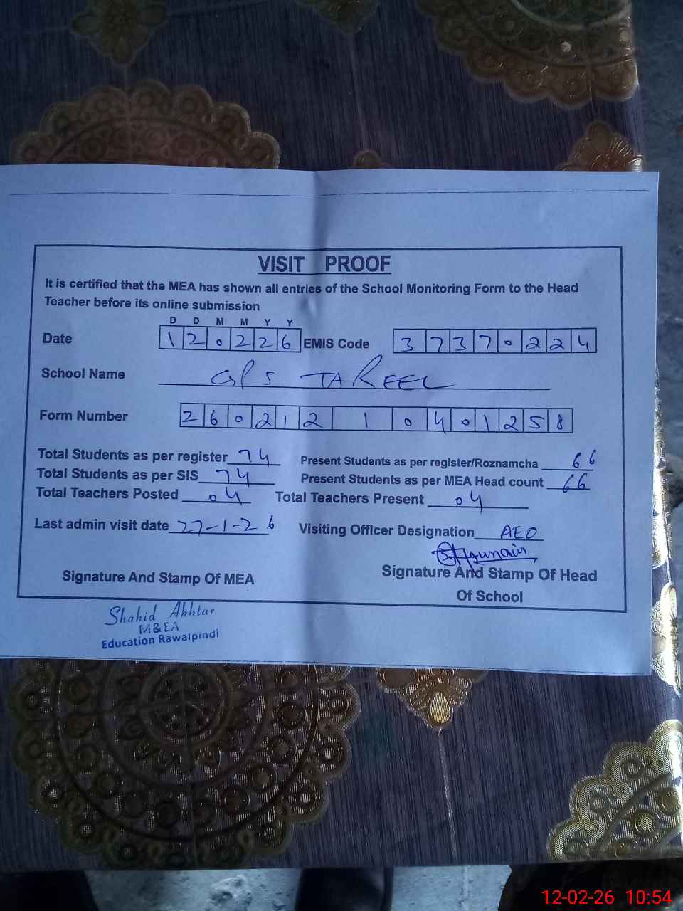 | Attendance Register | Head Teacher | MEA with School | Visit Proof |