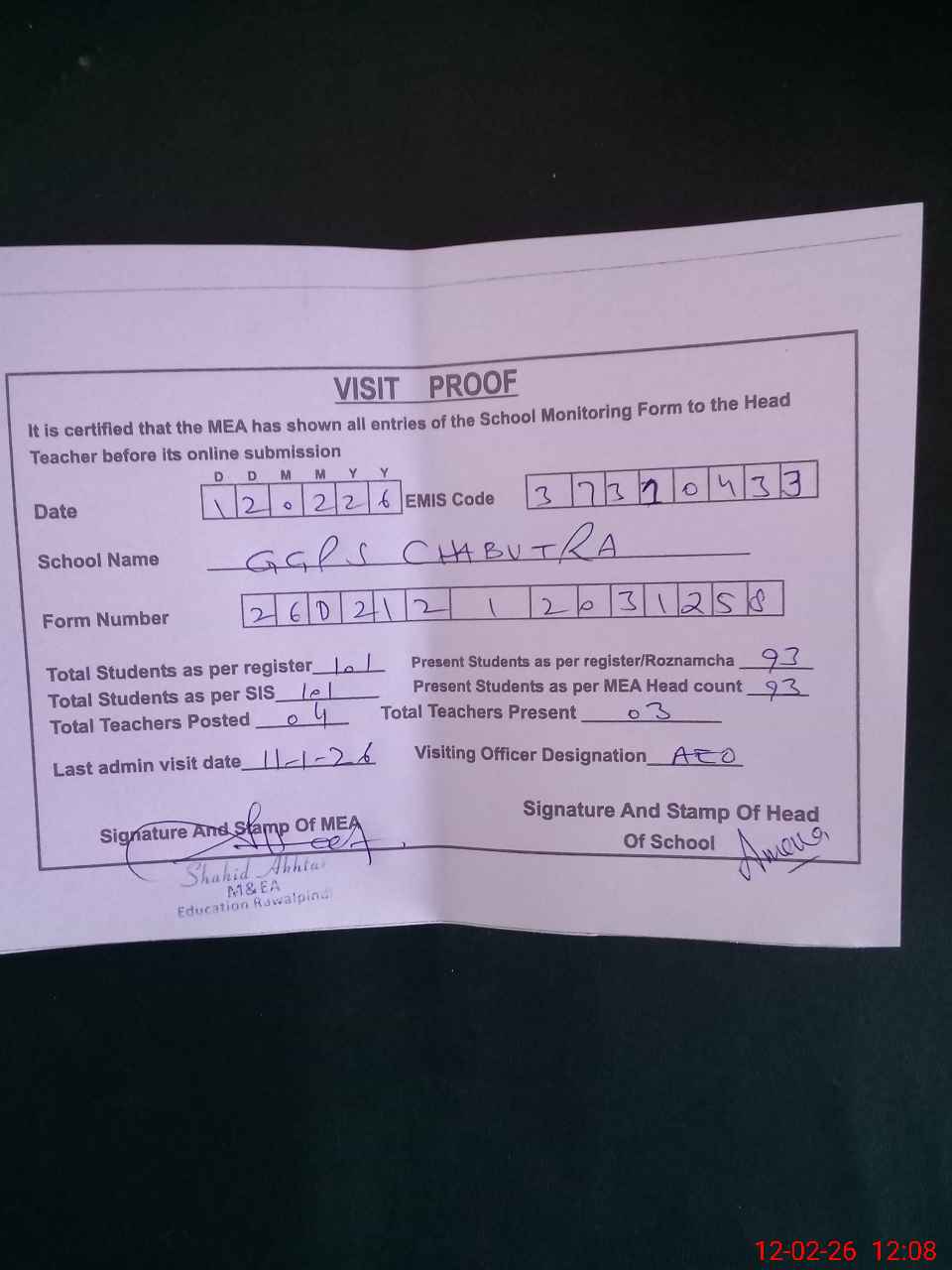 | Attendance Register | Head Teacher | MEA with School | Visit Proof |