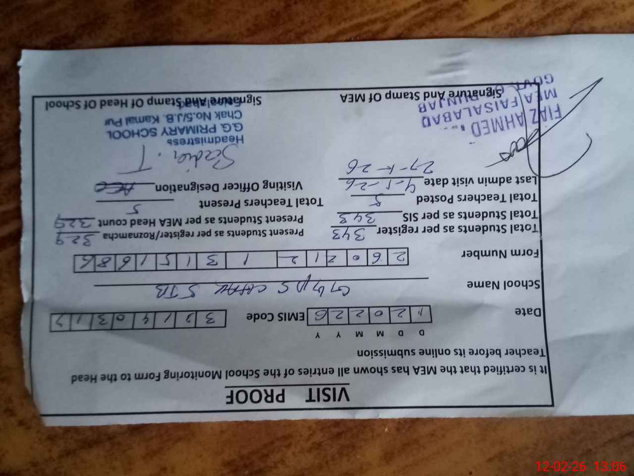 | Attendance Register | Head Teacher | MEA with School | Visit Proof |
