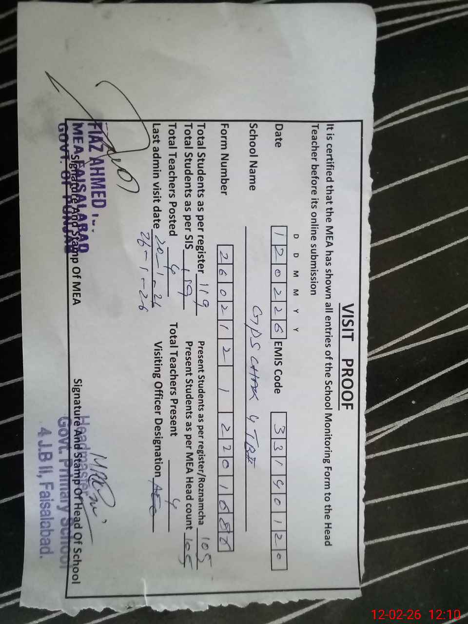 | Attendance Register | Head Teacher | MEA with School | Visit Proof |