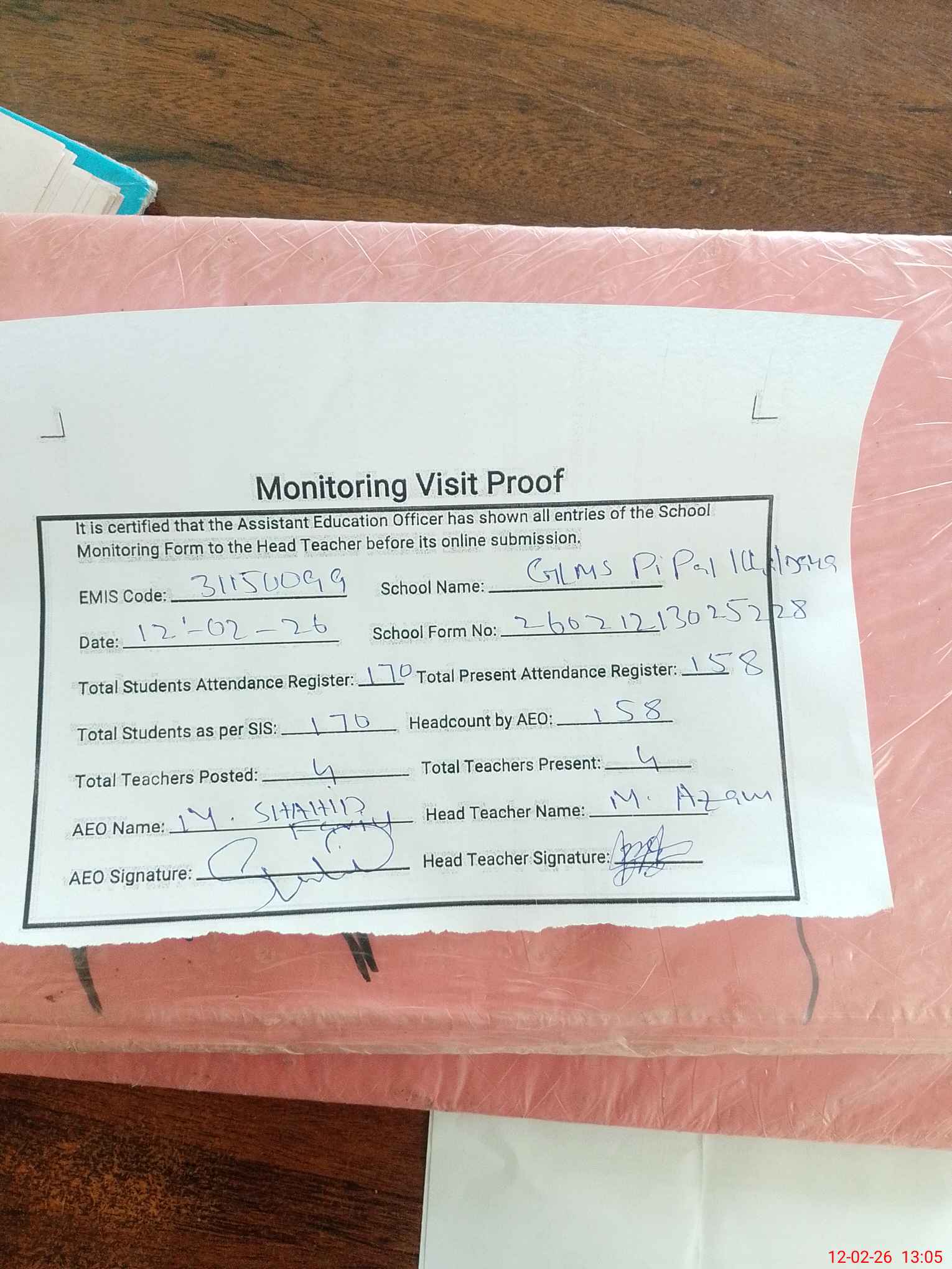 | Attendance Register | Head Teacher | MEA with School | Visit Proof |