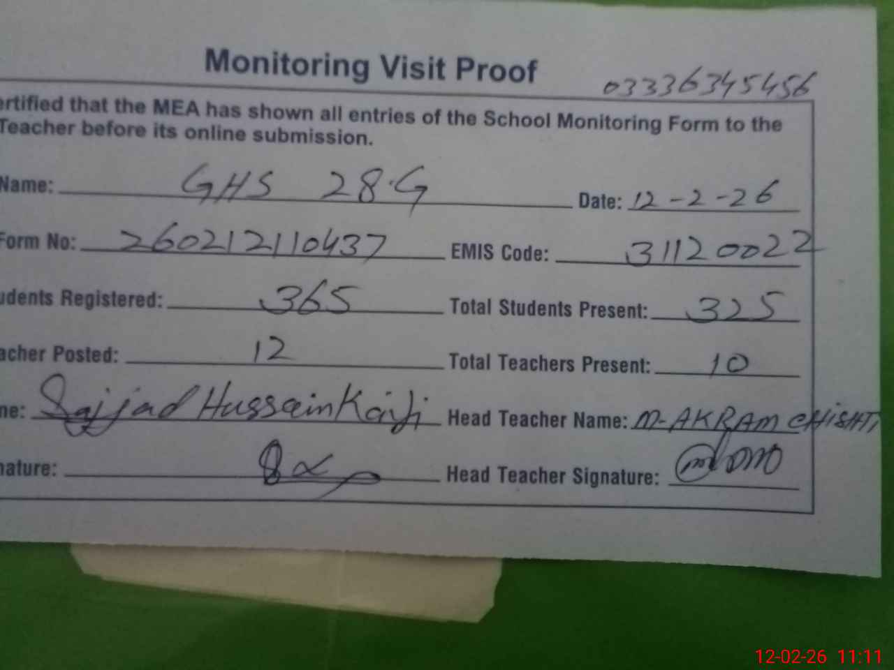 | EMIS Code: 31120022 | Name of School: GHS CHAK NO. 28/G | |||