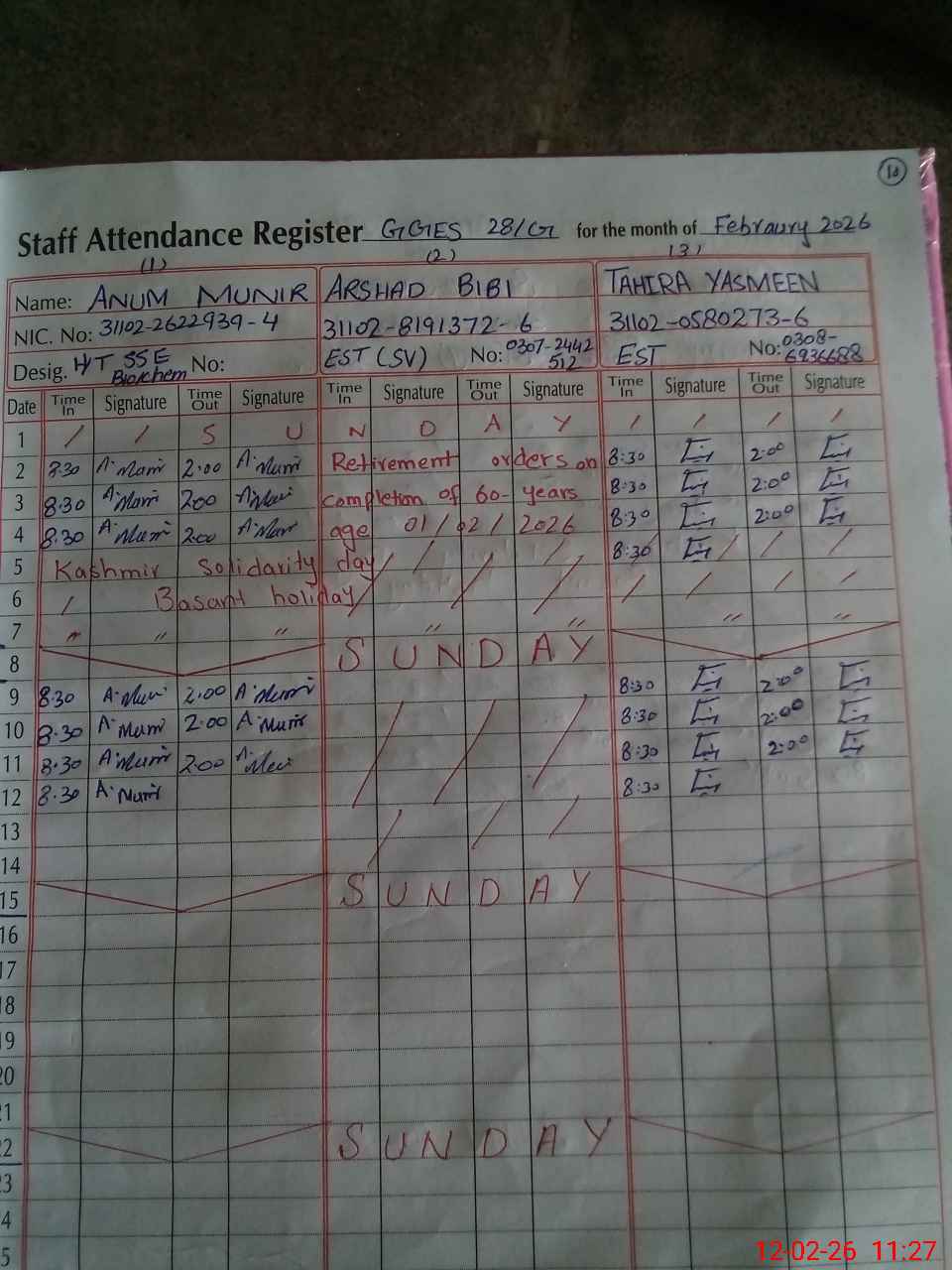 | CNIC | Full Name | Designation | R/C | Absence During Last Calender Month |
