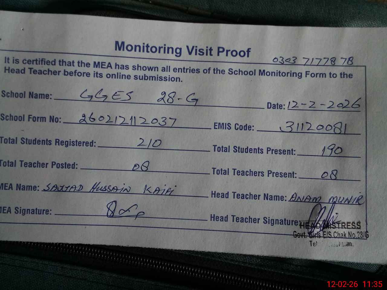 | EMIS Code: 31120081 | Name of School: GGES CHAK NO. 28/G | |||