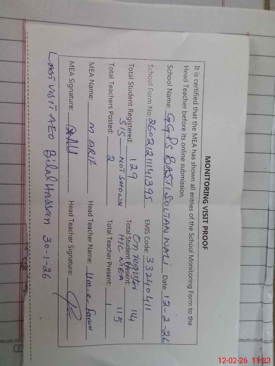 | Attendance Register | Head Teacher | MEA with School | Visit Proof |