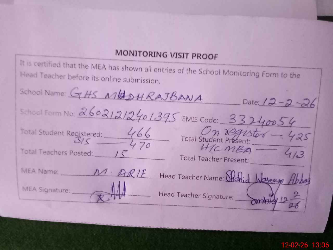 | Attendance Register | Head Teacher | MEA with School | Visit Proof |