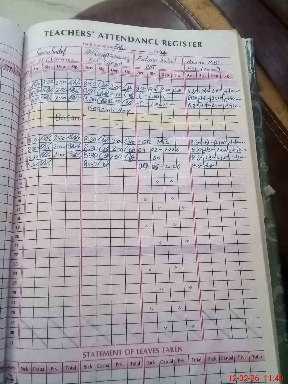 | Remarks (Use Separate Page if Required): leave of teacher Fatima Iqbal was not sectioned are apply online only MO advise | |||||