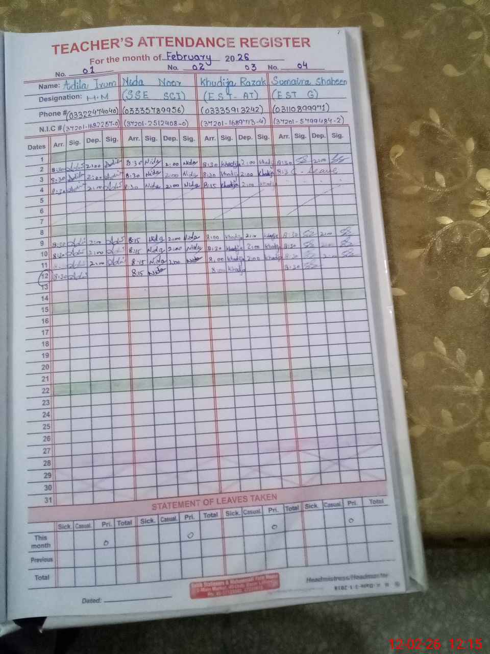 | Name: AD**** IR**** Designation: (School Headmaster's/Headmistress's) Headmistress Phone/Cell Number: 03**** |