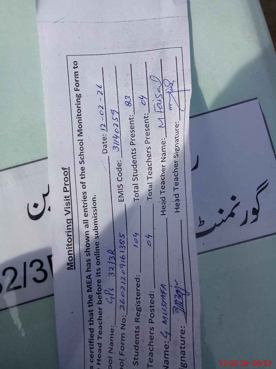 | EMIS Code: 31140259 | Name of School: GPS CHAK NO.32/3-R | |||