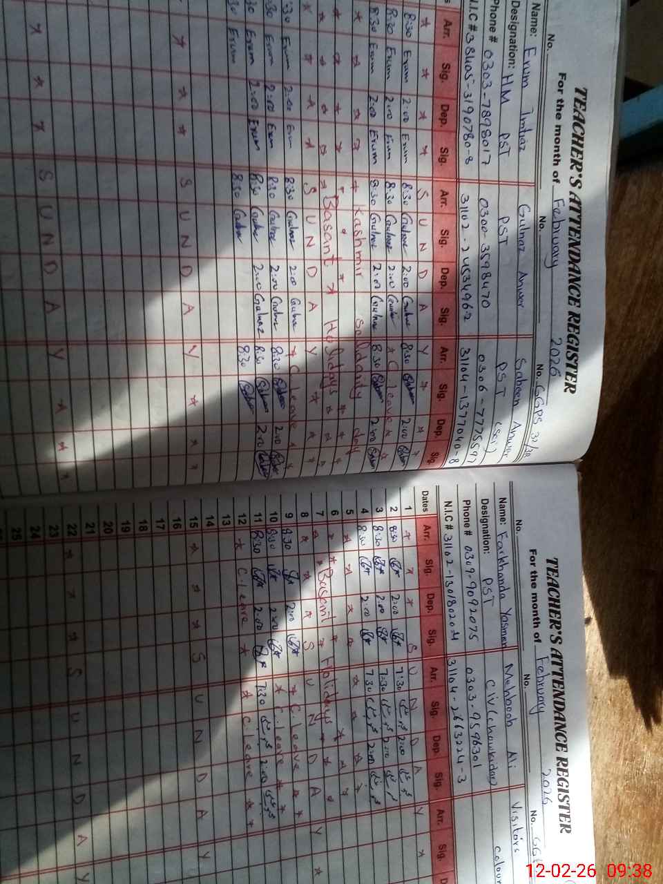 | CNIC | Full Name | Designation | R/C | Absence during last cal. month |