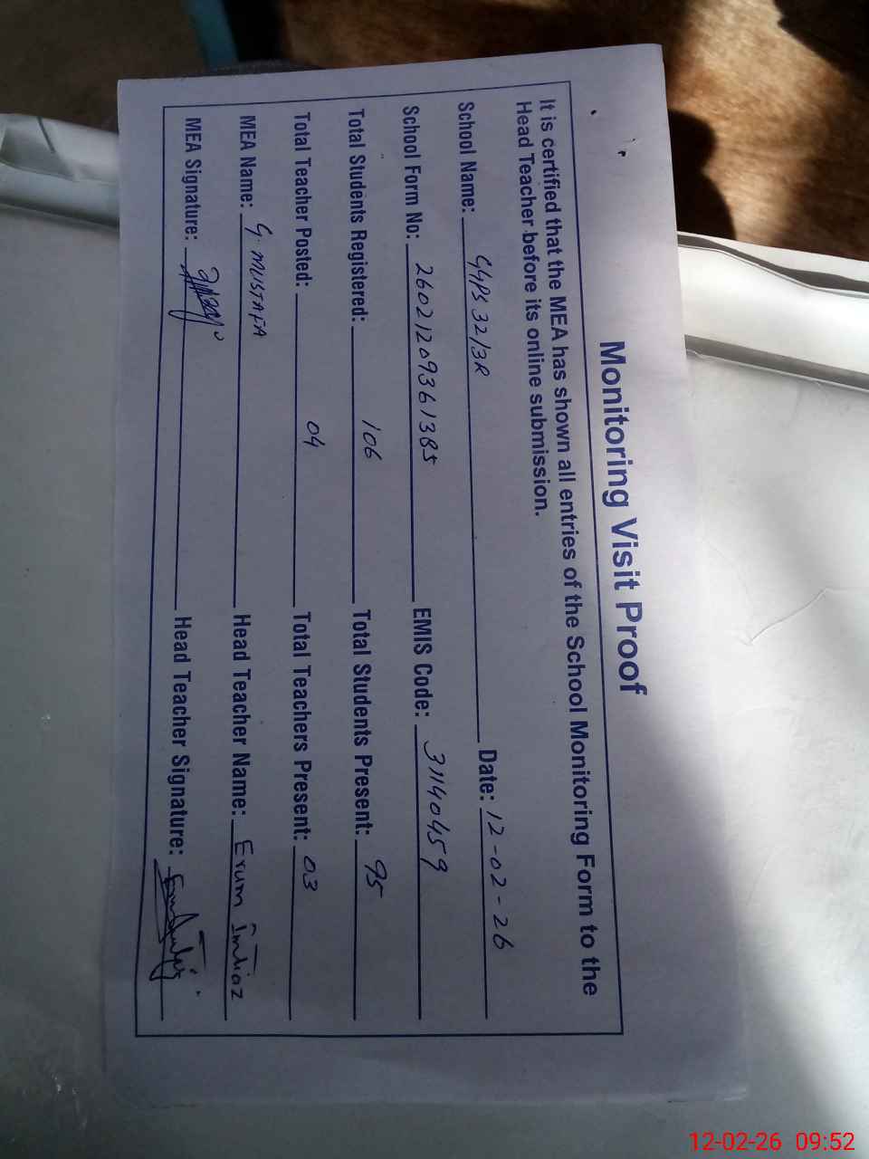 | Attendance Register | Head Teacher | MEA with School | Visit Proof |
