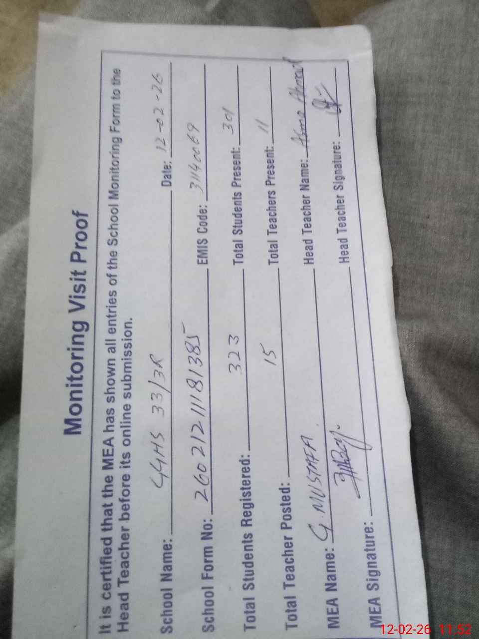 | Attendance Register | Head Teacher | MEA with School | Visit Proof |