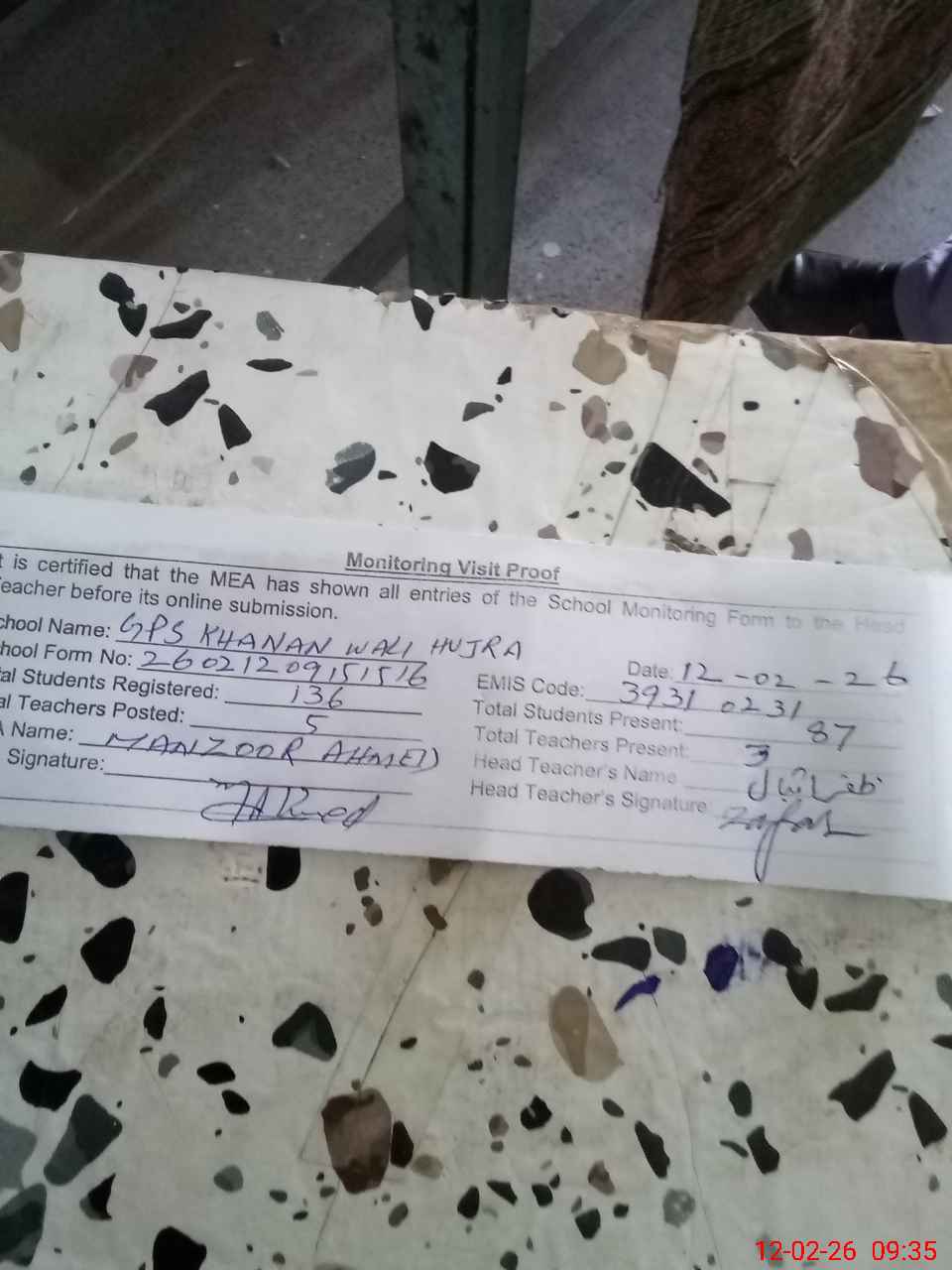 | EMIS Code: 39310231 | Name of School: GPS KHANAN WALI HUJRA | |||