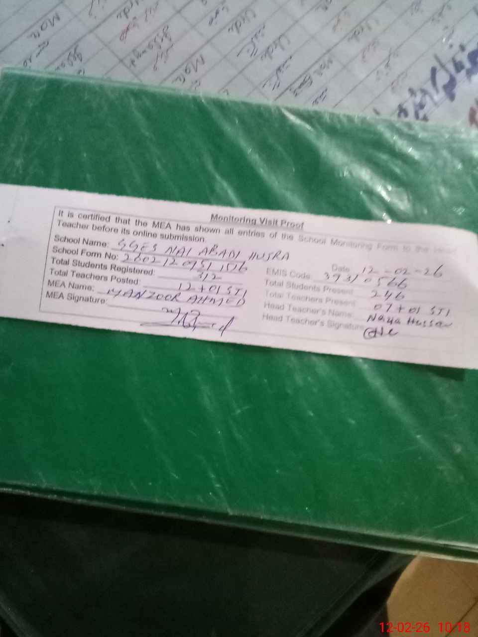 | Attendance Register | Head Teacher | MEA with School | Visit Proof |