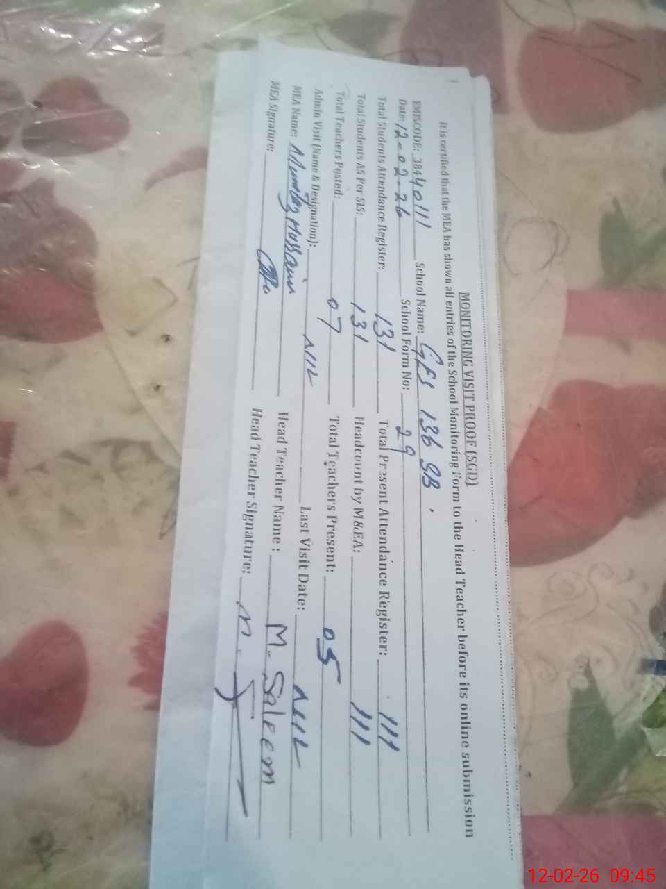 | Attendance Register | Head Teacher | MEA with School | Visit Proof |