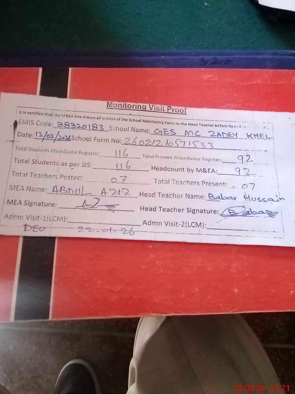 | EMIS Code: 38320183 | Name of School: GES MC ZADEY KHEL | |||