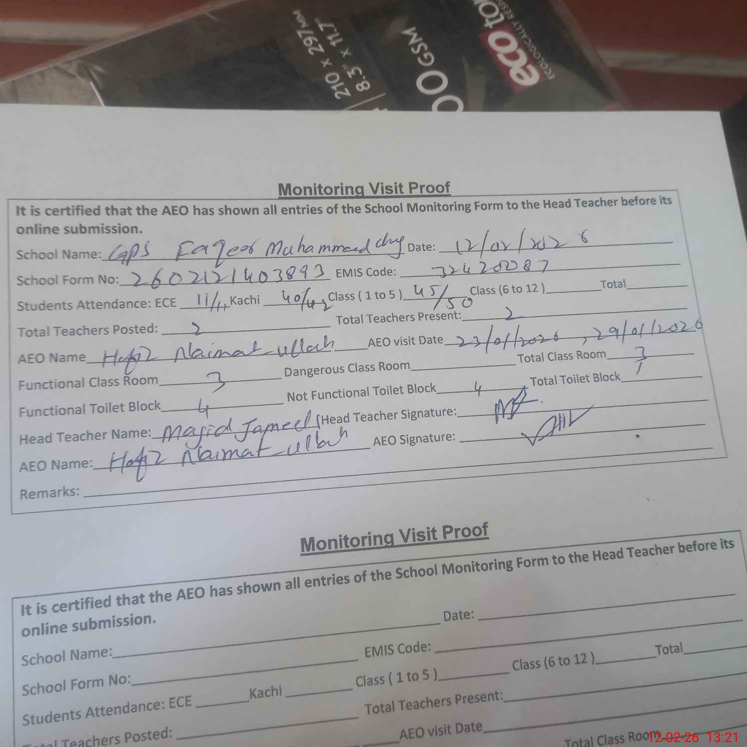 | Attendance Register | Head Teacher | MEA with School | Visit Proof |
