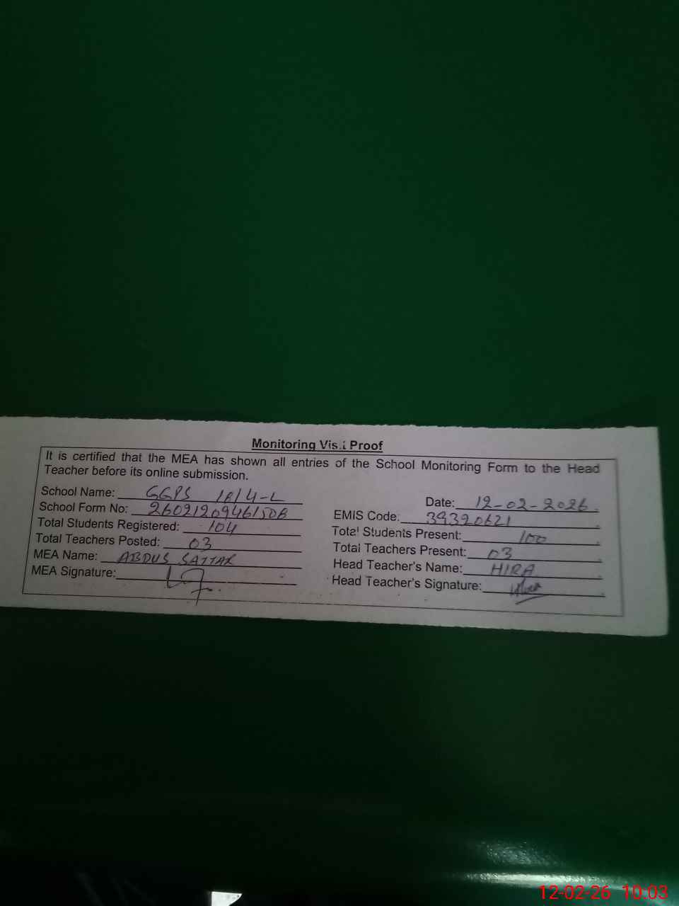 | Attendance Register | Head Teacher | MEA with School | Visit Proof |