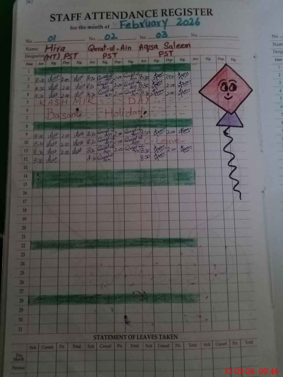 | Leave | Duty | Absent | Maternity | Medical | Ex- Pak |