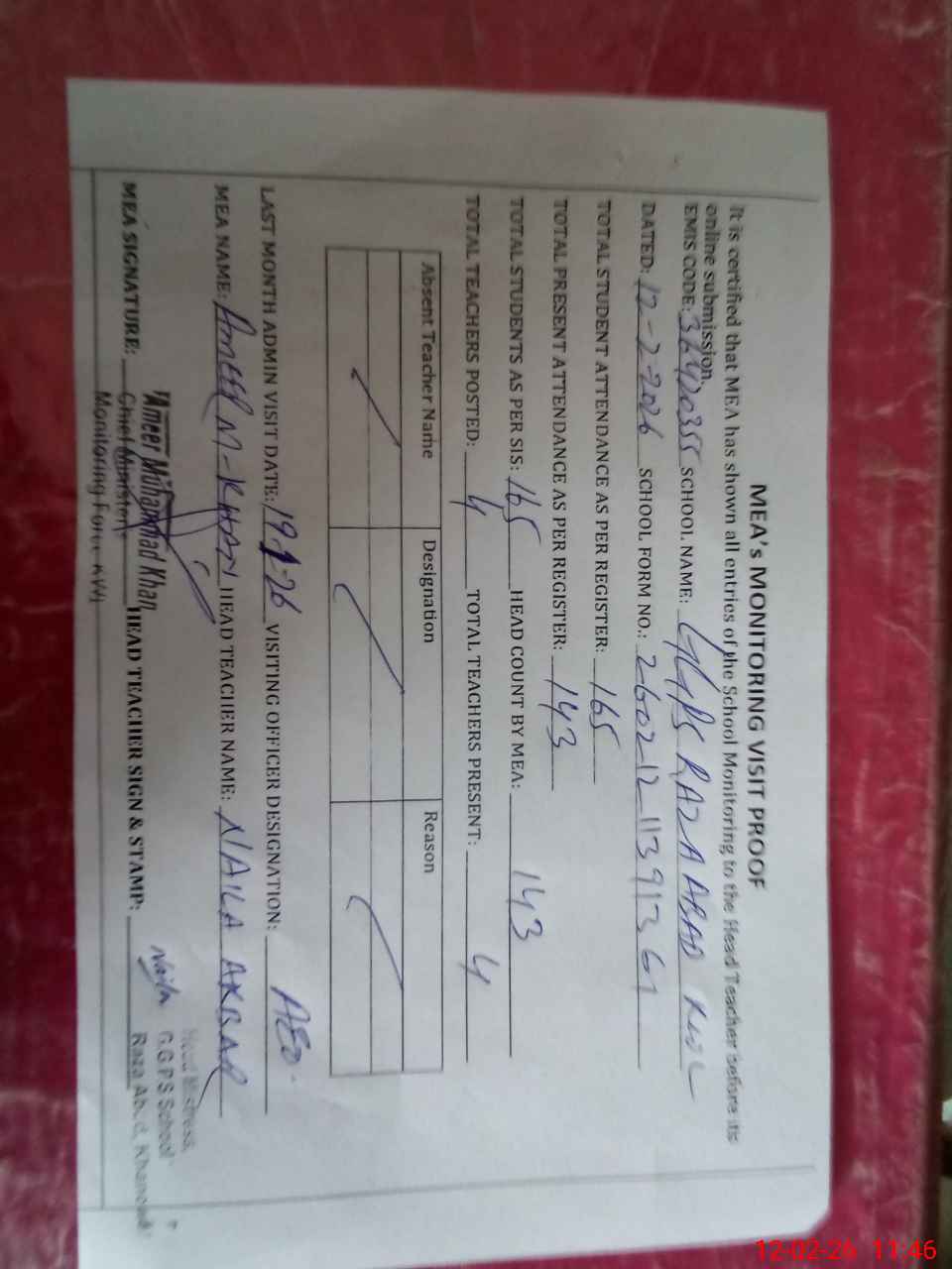 | Attendance Register | Head Teacher | MEA with School | Visit Proof |