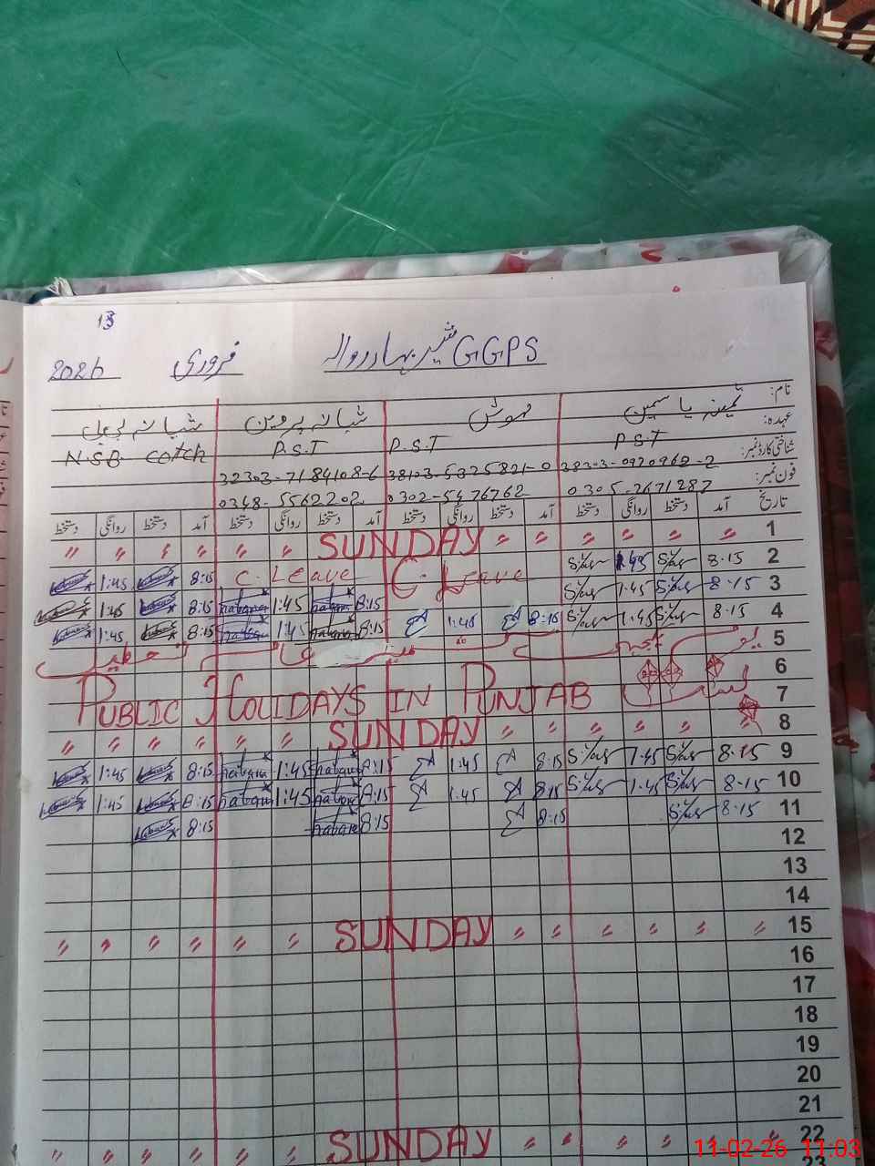 | CNIC | Full Name | Designation | R/C | Absence During Last Calender Month |