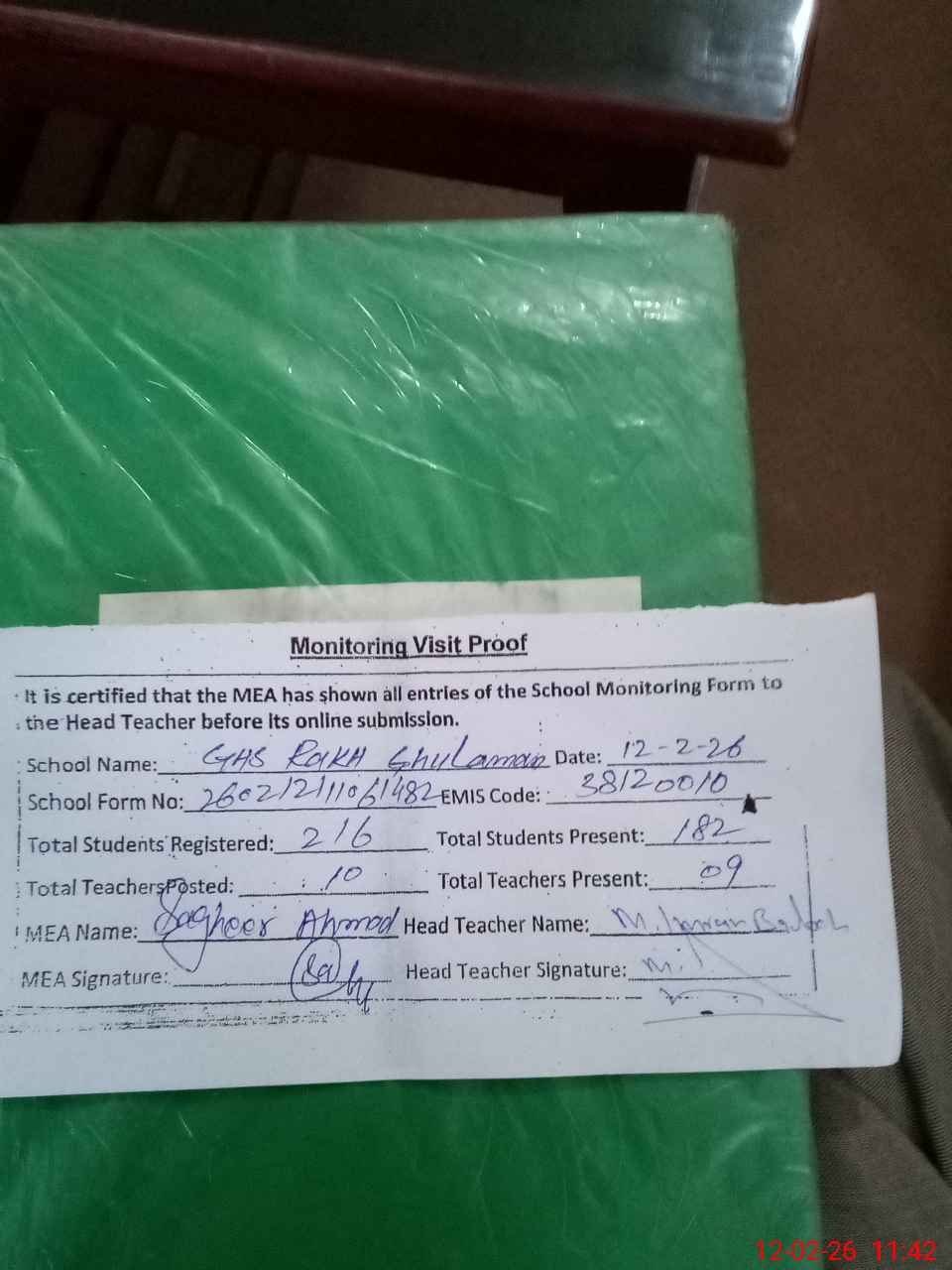 | Attendance Register | Head Teacher | MEA with School | Visit Proof |