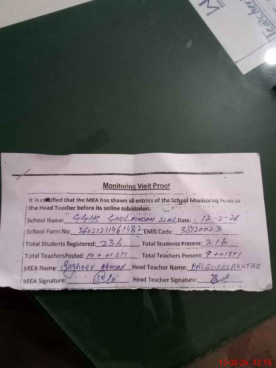 | Attendance Register | Head Teacher | MEA with School | Visit Proof |