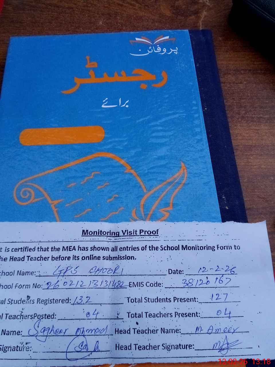 | Attendance Register | Head Teacher | MEA with School | Visit Proof |