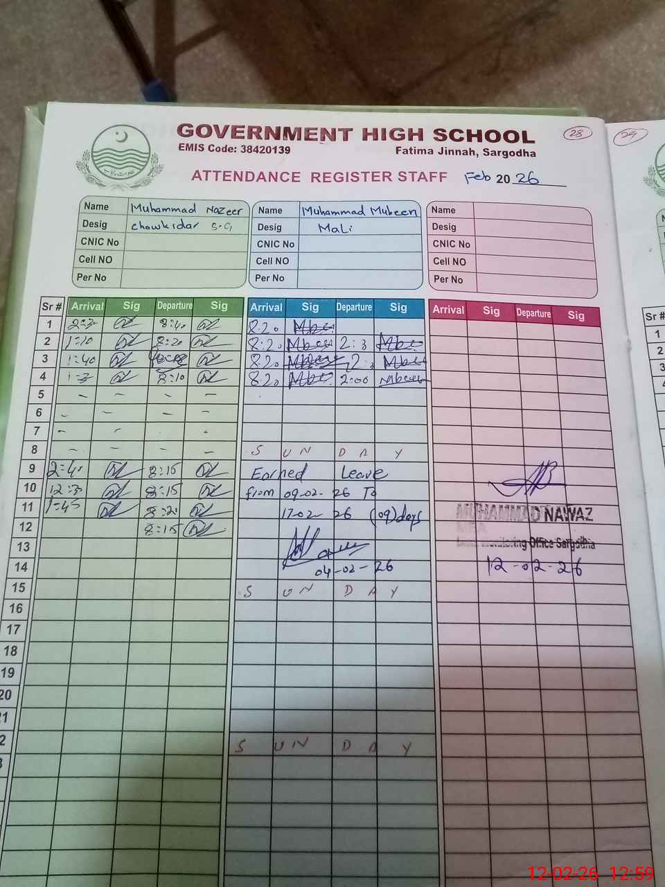 | CNIC | Full Name | Designation | R/C | Absence During Last Calender Month |