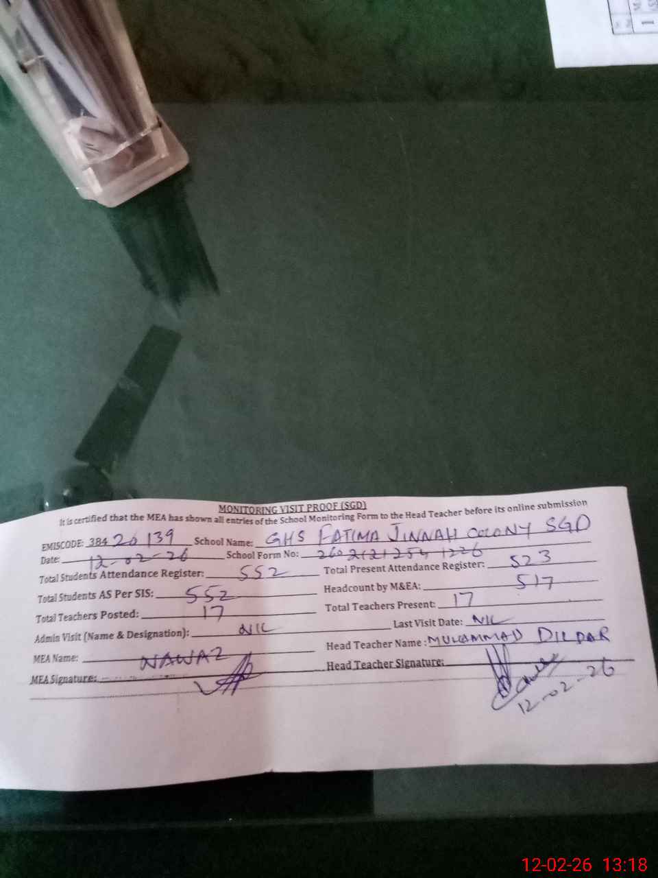 | Attendance Register | Head Teacher | MEA with School | Visit Proof |