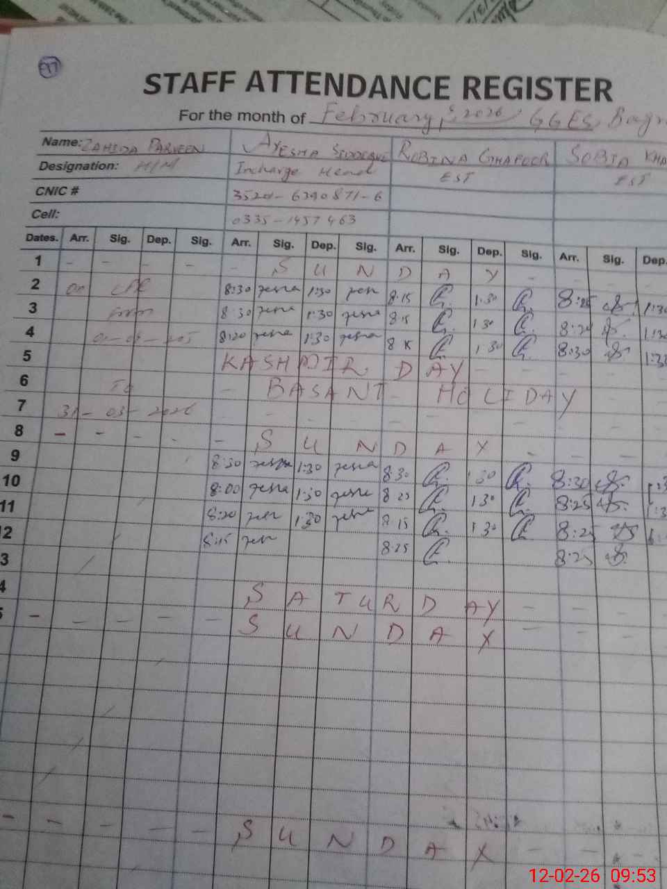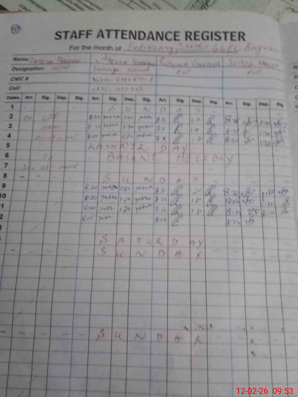 | CNIC | Full Name | Designation | R/C | Absence During Last Calender Month |