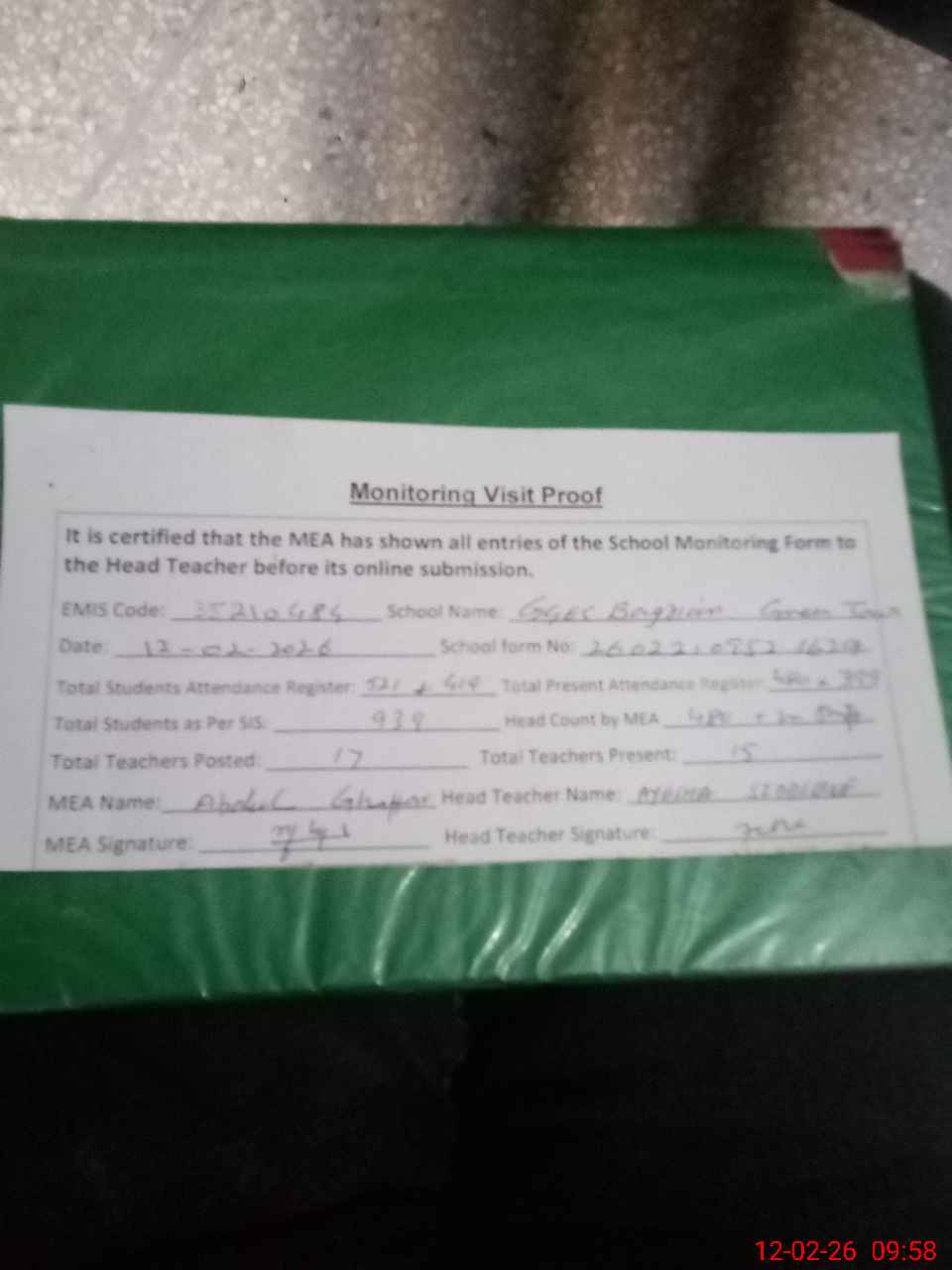| Attendance Register | Head Teacher | MEA with School | Visit Proof |