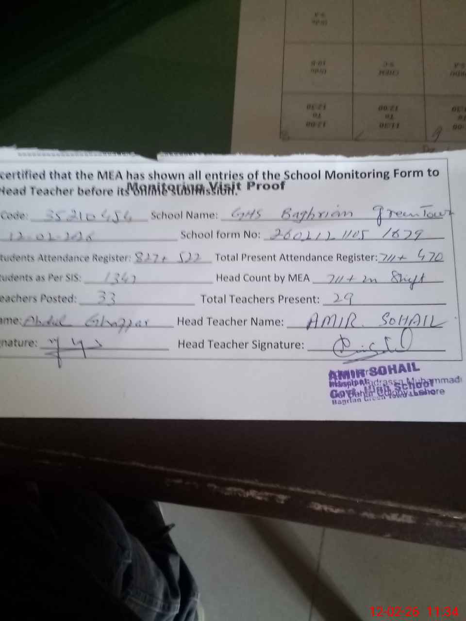 | Attendance Register | Head Teacher | MEA with School | Visit Proof |