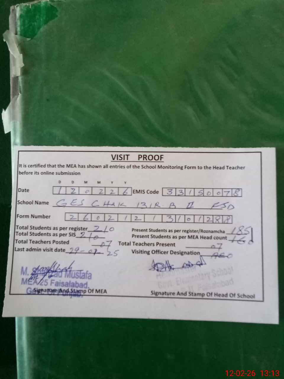 | Attendance Register | Head Teacher | MEA with School | Visit Proof |
