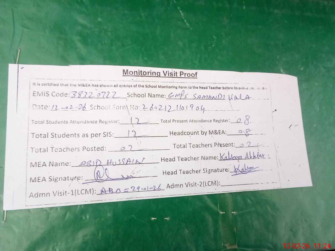 | Attendance Register | Head Teacher | MEA with School | Visit Proof |