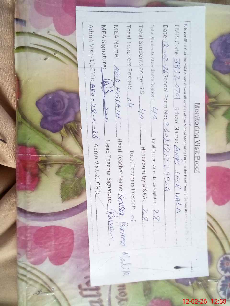 | Attendance Register | Head Teacher | MEA with School | Visit Proof |