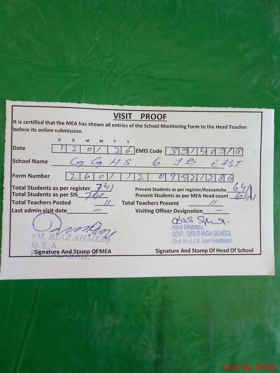 | Attendance Register | Head Teacher | MEA with School | Visit Proof |